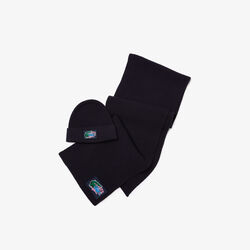 طقم هدايا لاكوست مكون من قبعة بيني ووشاح من صوف مضلع من تشكيلة موسم الأعياد للجنسين