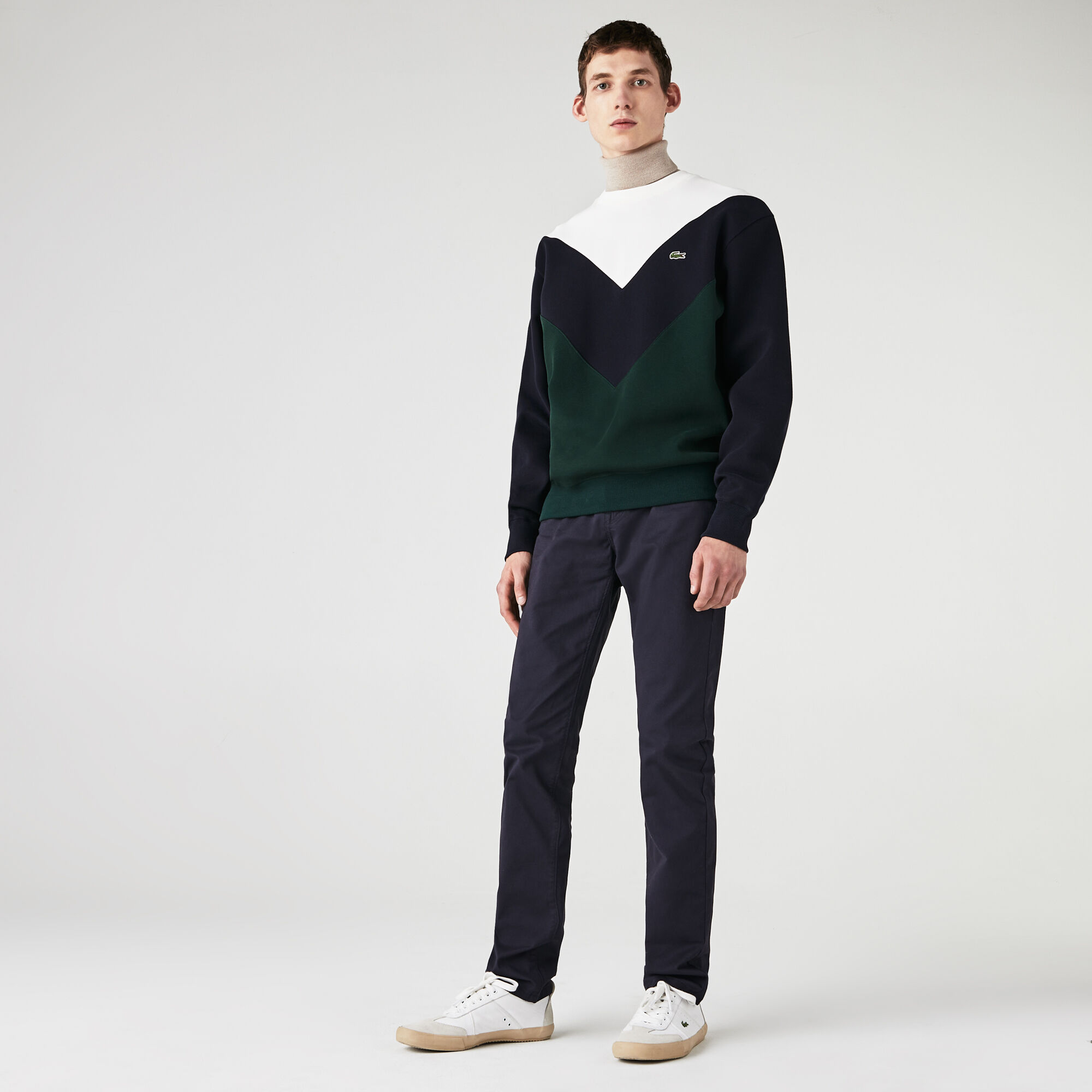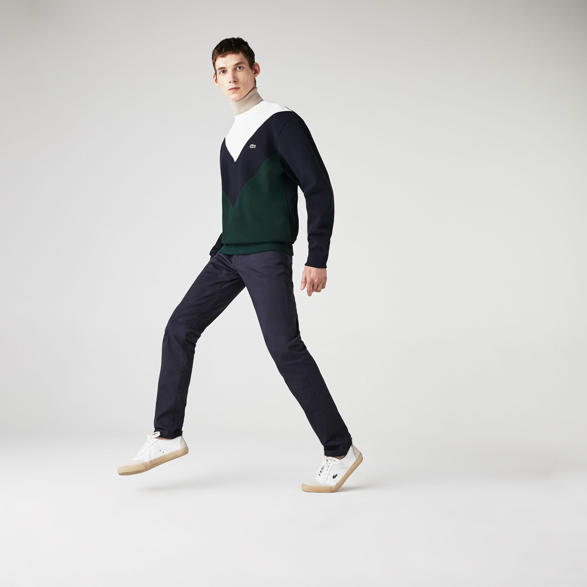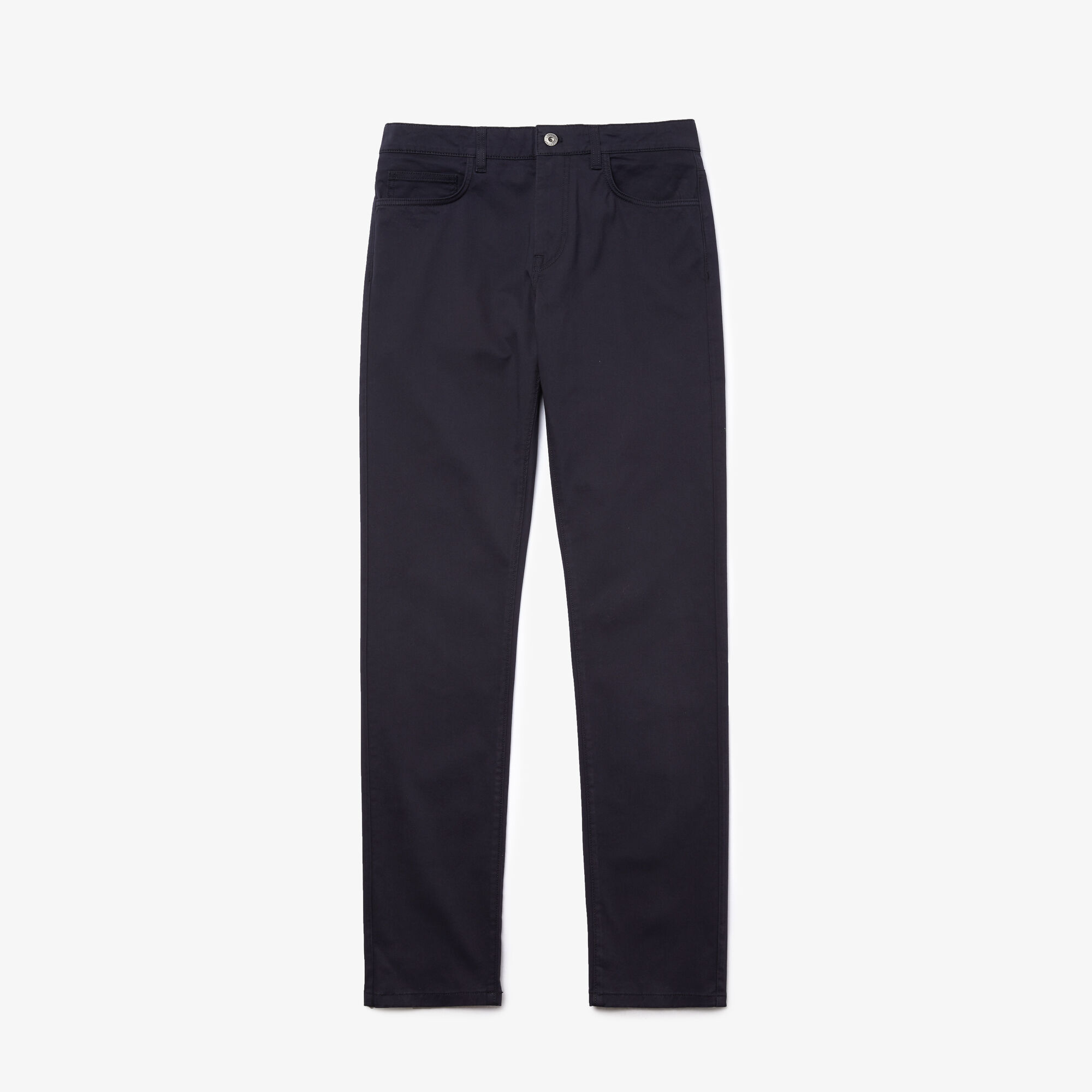 البنطال السادة بالجيوب الخمسة مصنوع بقصة ضيقة من قماش جبردين قطني مرن ومصمم بعلامة Lacoste جلدية في الخلف. أضف حذائك الرياضي المفضل.